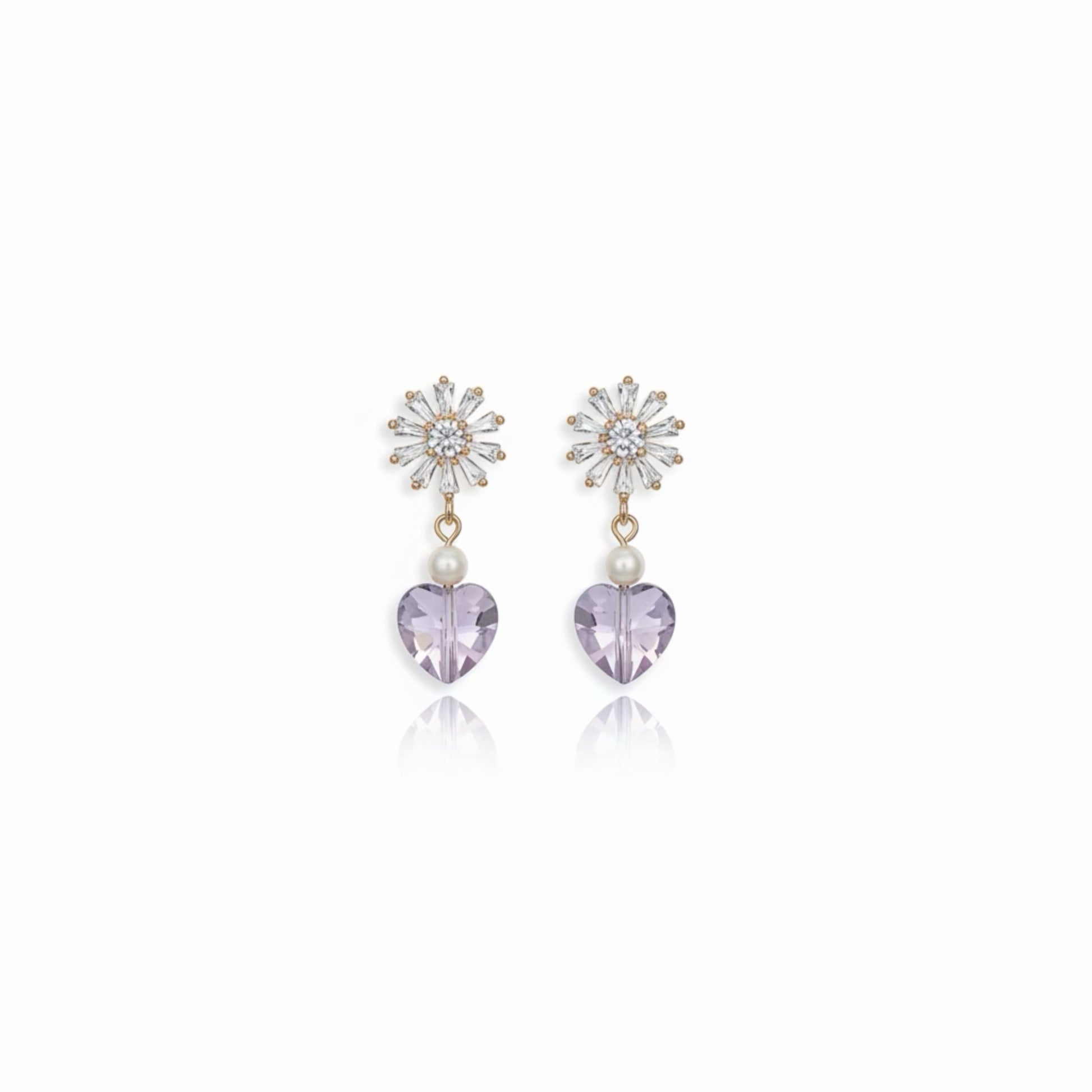 Ale - vee -na / Loved Friend; Magical. 18k Gold Dipped Cubic Zirconia Snowflake Satin Pearl Lavender Glass Heart Drop Earrings. Snowflakes Symbolize Purity, New Beginnings, and Transformation. The Color Lavender Represents Creativity, Ambition, and Calmness. Pearls Symbolize Wealth, Purity, & Wisdom; Wear Pearls To Attract Fortune And New Opportunities.