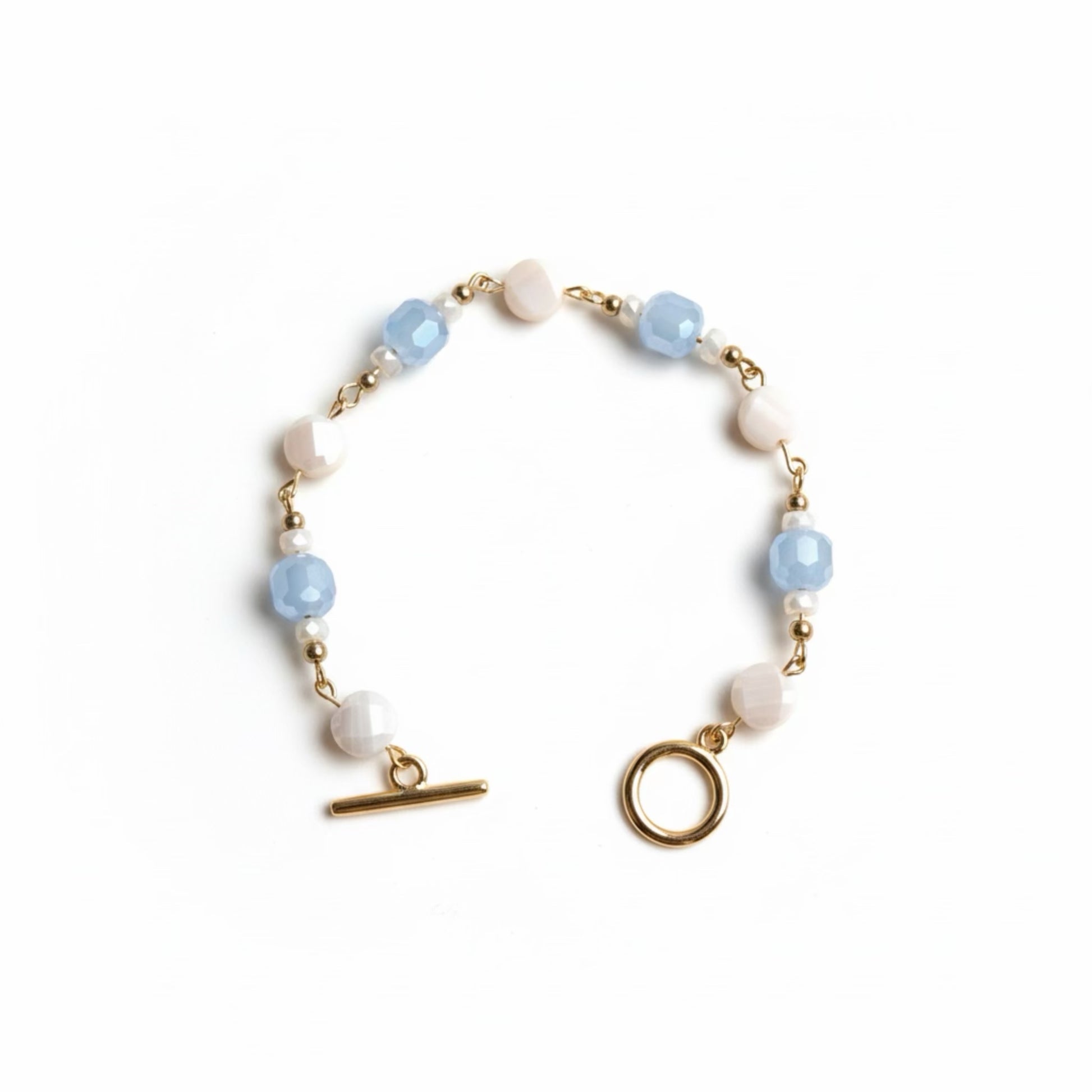 O - cean / From The Ocean. 18k Gold Dipped Powder Blue & Pink Sand Faceted Crystal Bracelet. Océane is a sophisticated bracelet that not only adds a touch of elegance to your outfit, but also promotes harmony and beauty inspired by sea life. Expertly crafted with high-quality materials, this bracelet is a must-have for anyone looking to add a touch of natural beauty to their style.