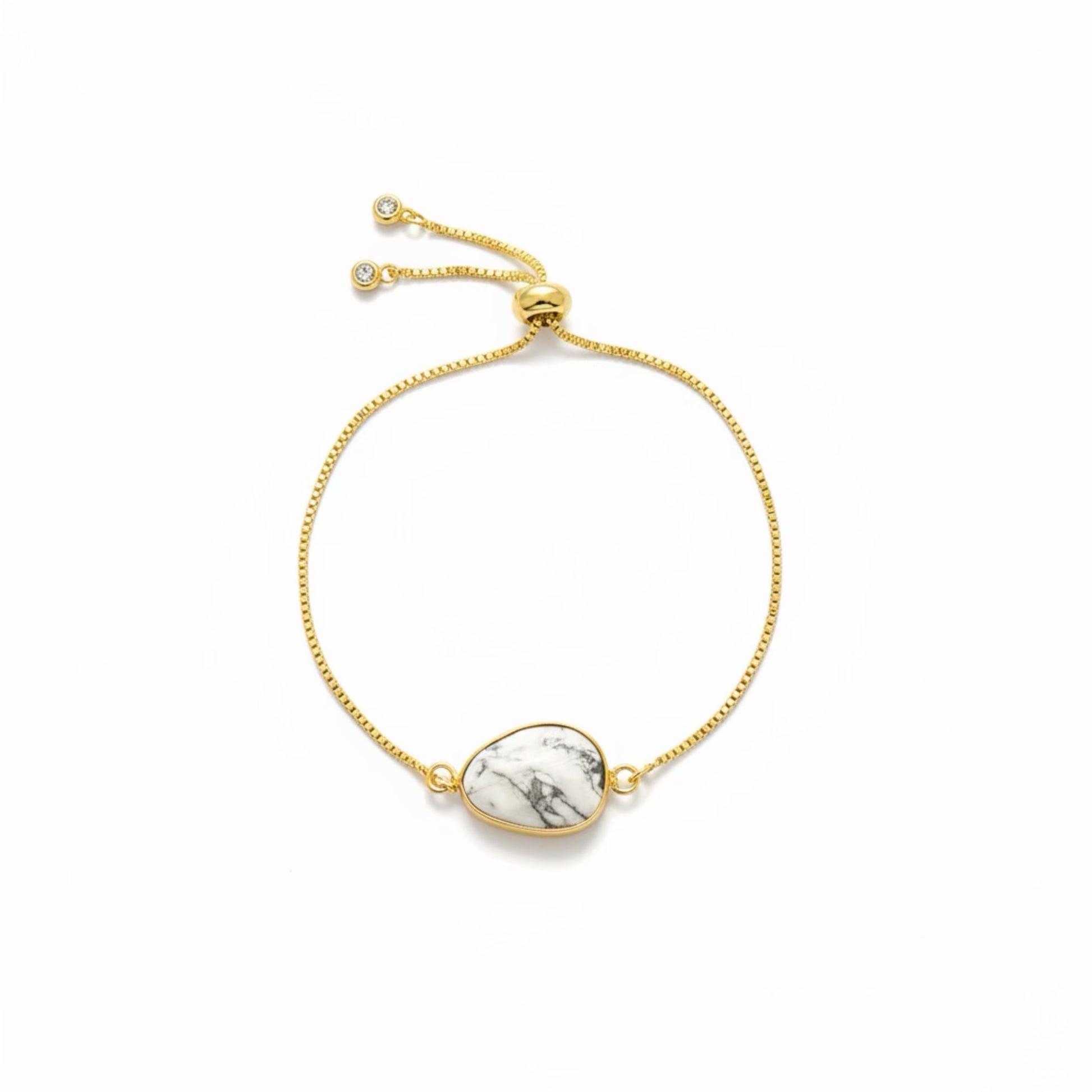 Oh - LIV - Ee - Uh / Olive Tree, Fruitfulness, Beauty, Dignity, & Peace. 18k Gold Plated Stainless Steel Howlite Slider Bracelet With Cubic Zirconia Crystal Extenders. Howlite Gemstones Are Use To Help Calm Energy, Reduce Stress Levels/Insomnia, And Unburdens An Overactive Mind Helping The Person Wearing It Make Sound Decisions.